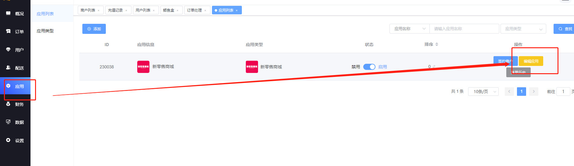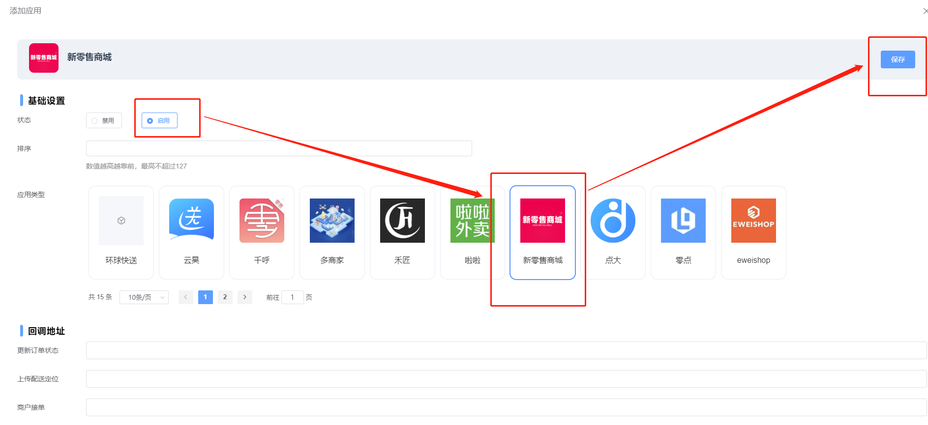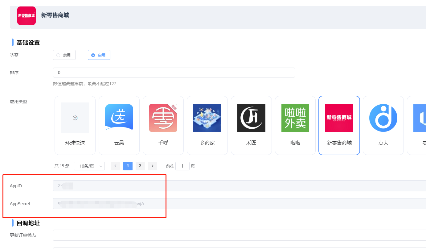 鲫鱼代理后台应用-应用列表那里添加一个“新零售商城”类型的应用。